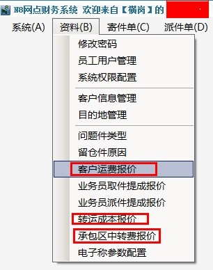 承包區(qū)中轉(zhuǎn)費:是網(wǎng)點向承包區(qū)(或業(yè)務(wù)員)收取的出貨費。一般也是按快件重量和目的地,通過公式計算得到的(在F8系統(tǒng)里叫”承包區(qū)中轉(zhuǎn)費維護“,F(xiàn)8系統(tǒng)能自動按報價計算,不同的目的地價格不同,不同的承包區(qū)價格可以不一樣)。