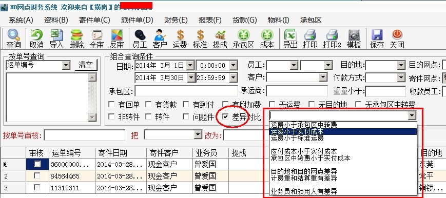 打開F8系統(tǒng)"寄件單-->寄件單審核"界面,你會看到有一個"差異對比"勾選框。右邊的選取框里可以選擇要對比的項目: